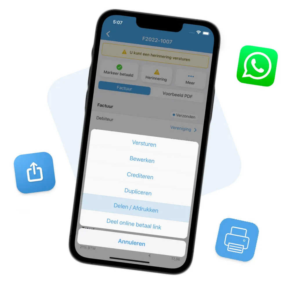 Vanaf nu is het mogelijk om offertes en facturen via de mobiele app te delen en te printen. Handig als je deze bijvoorbeeld via WhatsApp wilt delen met de klant of deze ter plekke wilt uitprinten! Zowel bij de offertes als bij de facturen is hiervoor een extra actieknop toegevoegd "Delen / Afdrukken".