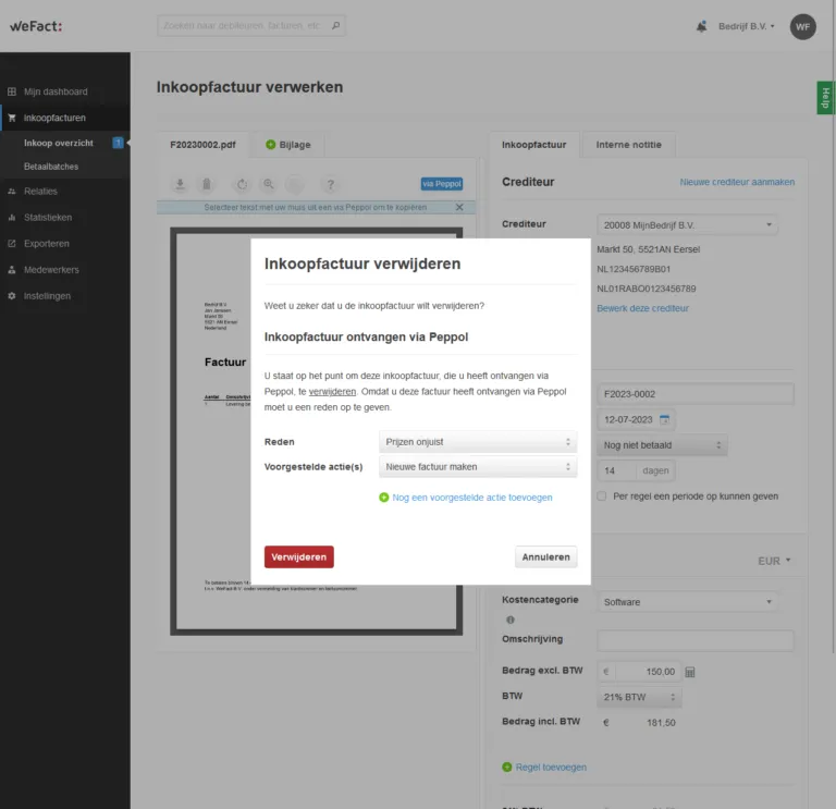 Wanneer je een inkoopfactuur binnen krijgt en deze wilt weigeren of verwijderen, krijg je de optie om een reden en voorgestelde actie op te geven. Dit ziet er als volgt uit: