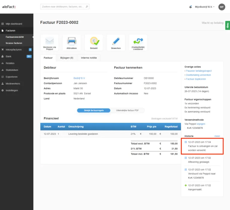 Om statusberichten vanuit het Peppol-netwerk te ontvangen, moet je geregistreerd zijn bij het Peppol netwerk. Om de statusberichten op te halen dien je Peppol voor zowel verkoop- als inkoopfacturen ingeschakeld te hebben in WeFact. Een voorbeeld van een statusmelding volgt hieronder. In dit geval is het een statusmelding van een verzonden factuur die is aangekomen bij de ontvanger.