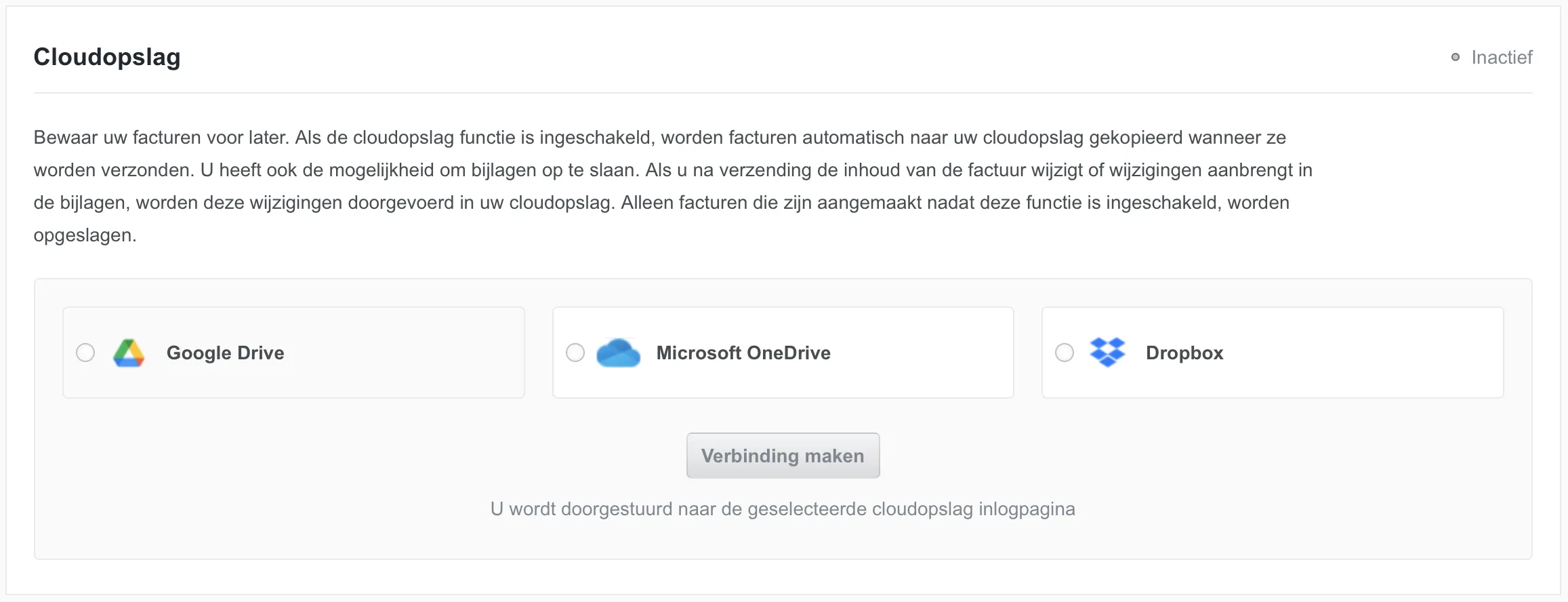 Met de cloudopslagfunctie kunt u automatisch een back-up van facturen opslaan in een clouddienst naar keuze, zoals Google Drive, Dropbox of Microsoft OneDrive. Zodra deze functie is ingeschakeld, worden nieuwe facturen automatisch opgeslagen. Daarnaast kunt u ervoor kiezen om ook bijlagen bij facturen op te slaan.