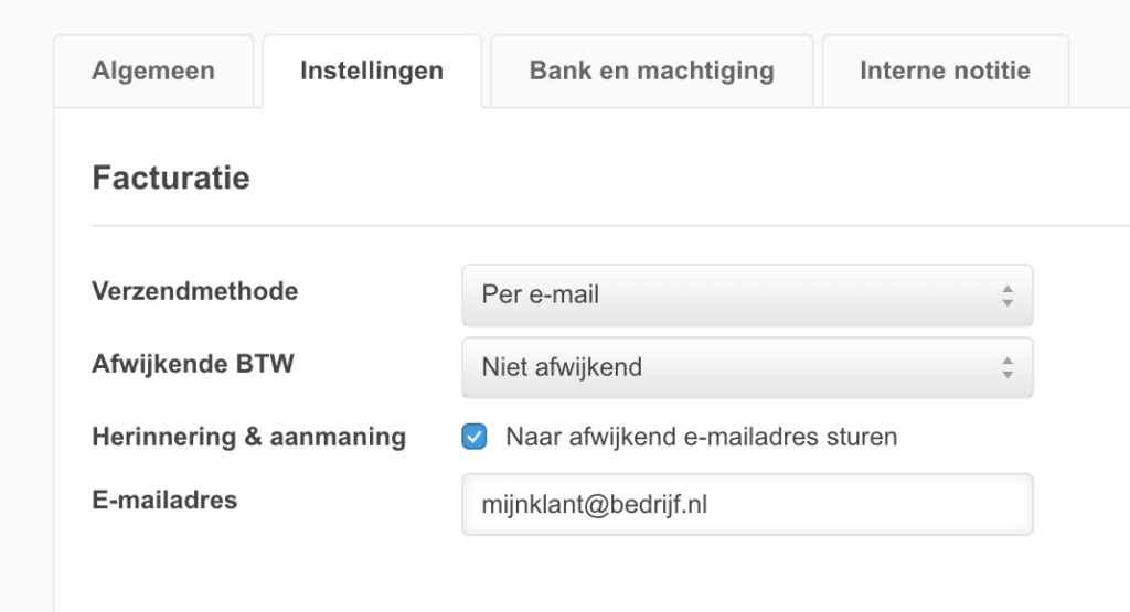 Het is mogelijk het e-mailbericht voor de herinnering en aanmaning naar een ander e-mailadres te versturen dan het e-mailadres waar de factuur naar verzonden wordt.