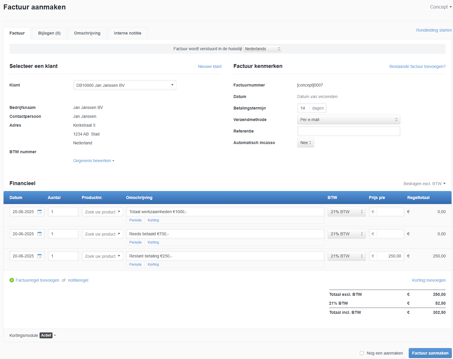 - Een derde regel met omschrijving "50% betaling" en een bedrag van € 500.