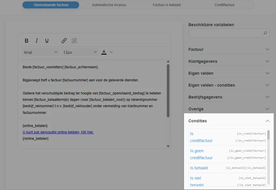 WeFact maakt het mogelijk om condities te gebruiken in teksten op facturen, offertes en e-mails. Met een conditie bepaalt u of een stuk tekst wel of niet wordt weergegeven, afhankelijk van de inhoud van een specifiek veld in WeFact.