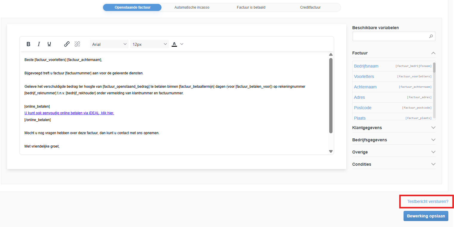 Standaard is het e-mailadres dat is ingesteld bij de bedrijfsgegevens het afzender e-mailadres voor al uw e-mailberichten vanuit WeFact. Wenst u deze te wijzigen dan kan dit via menuknop "Instellingen" submenu "Bedrijfsgegevens".