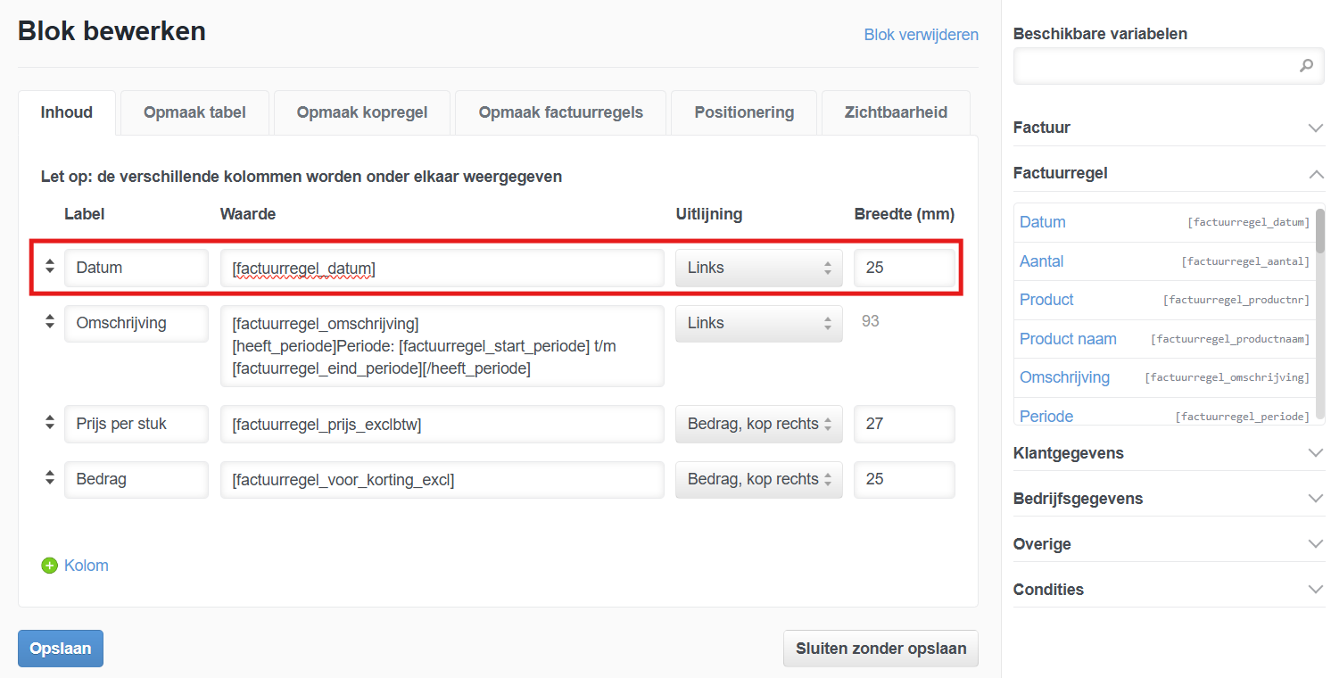 Ga via menuknop "Instellingen" naar "Huisstijl" en kies in de linkerrij onder PDF bestanden voor "Factuur". Klik op het factuurregelblok. Voeg hier een nieuwe kolom toe met als label "Datum". Voor de waarde kiest u aan de rechterzijde in de beschikbare variabelen tabel voor "Factuurregel" en klikt u vervolgens op "Datum". Plak de gekopieerde variabele nu in het veld waarde. U sleept de nieuwe kolom naar de gewenste positie door de muis aan de voorzijde van de regel ingedrukt te houden. Tot slot sla je de bewerking op.
