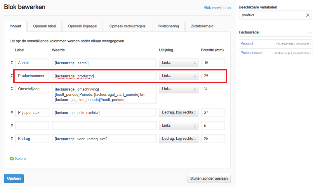 - Kies aan de rechterzijde, in de tabel met beschikbare variabelen, voor "Product" en klik vervolgens op "Product". De variabele [factuurregel_productnr] wordt automatisch gekopieerd.
