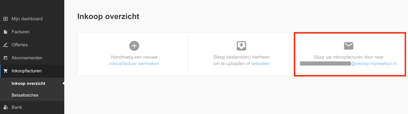 U vindt het persoonlijk inkoop e-mailadres in uw WeFact administratie wanneer u navigeert naar het inkoopoverzicht in het menu onder ‘Inkoopfacturen’. Het e-mailadres bestaat uit een persoonlijke code gevolgd door @inkoop.mijnwefact.nl.