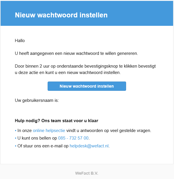 - U ontvangt een e-mail met een link om uw wachtwoord opnieuw in te stellen. (Let op: De link is 2 uur geldig)