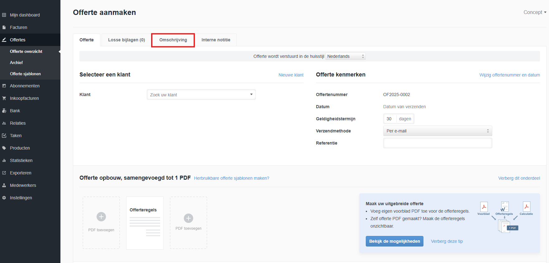 Op de offerteaanmaakpagina kunt u de gewenste tekst bovenin ingeven in het tabblad "Omschrijving".