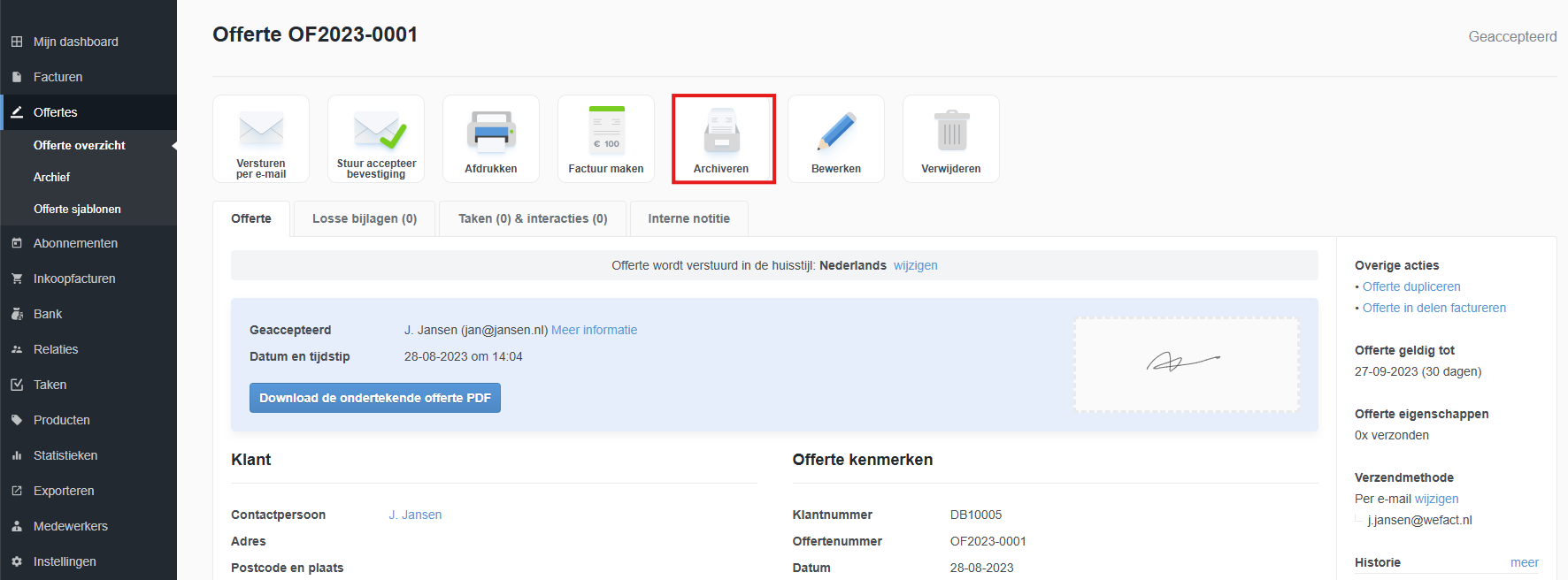 1) Bovenaan een geopende offerte zie je de actieknop “Archiveren”. Door hier op te klikken en te bevestigen zal de offerte direct in het archief worden geplaatst.