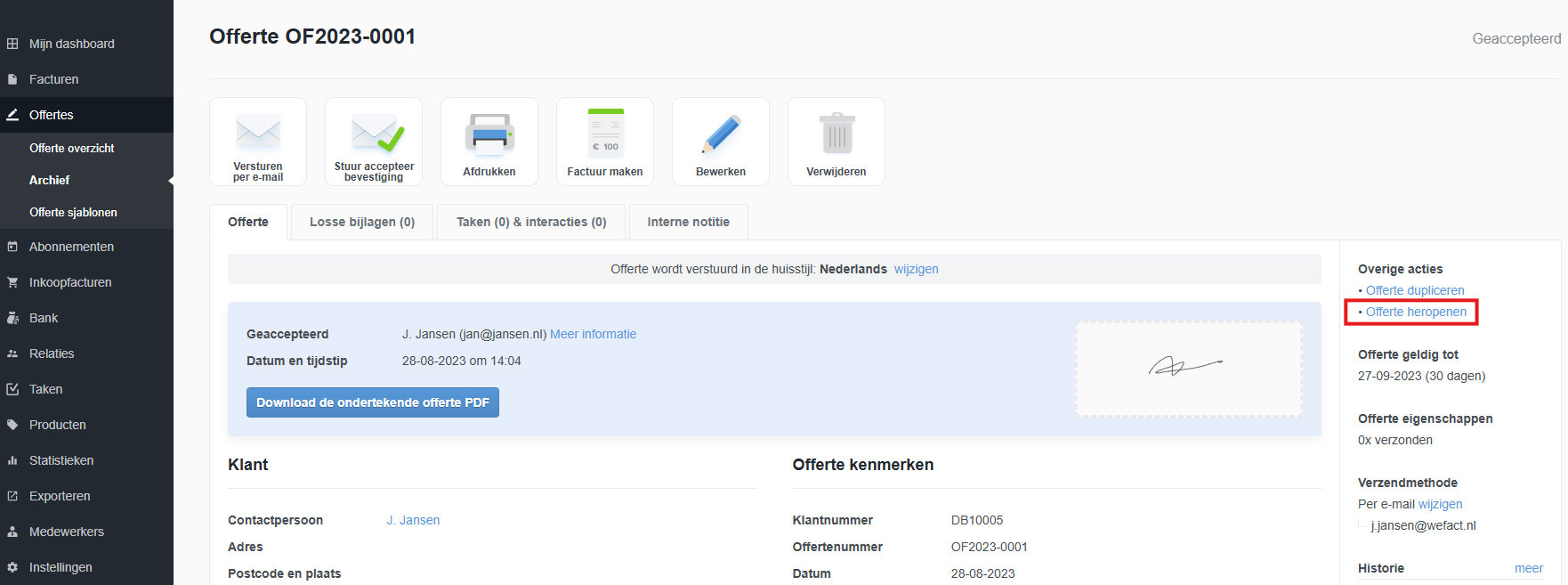 Wilt u de offerte toch weer heropenen, zodat de offerte geaccepteerd of geweigerd kan worden? Dan gaat u naar de bewuste offerte en kliktu aan de rechterkant bij "Overige acties" de blauwe link "Offerte heropenen".