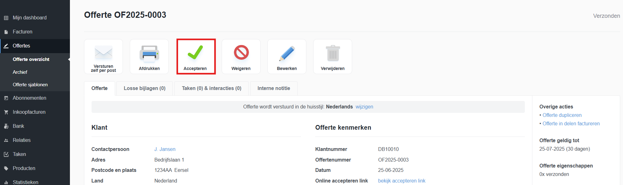 Wanneer u een offerte naar een klant heeft gestuurd en deze is goedgekeurd, kunt u er eenvoudig een factuur van maken. Eerst dient u de offerte op 'geaccepteerd' te zetten. Ga hiervoor naar de offerte en klik bovenaan op de actieknop "Accepteren". Een venster zal verschijnen met de vraag of u direct een factuur wilt maken. Als u later een factuur wilt aanmaken is dit geen probleem. Geef in het venster aan dat u geen factuur wilt aanmaken.