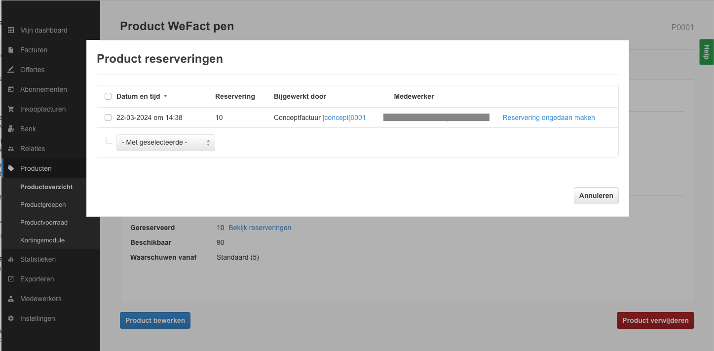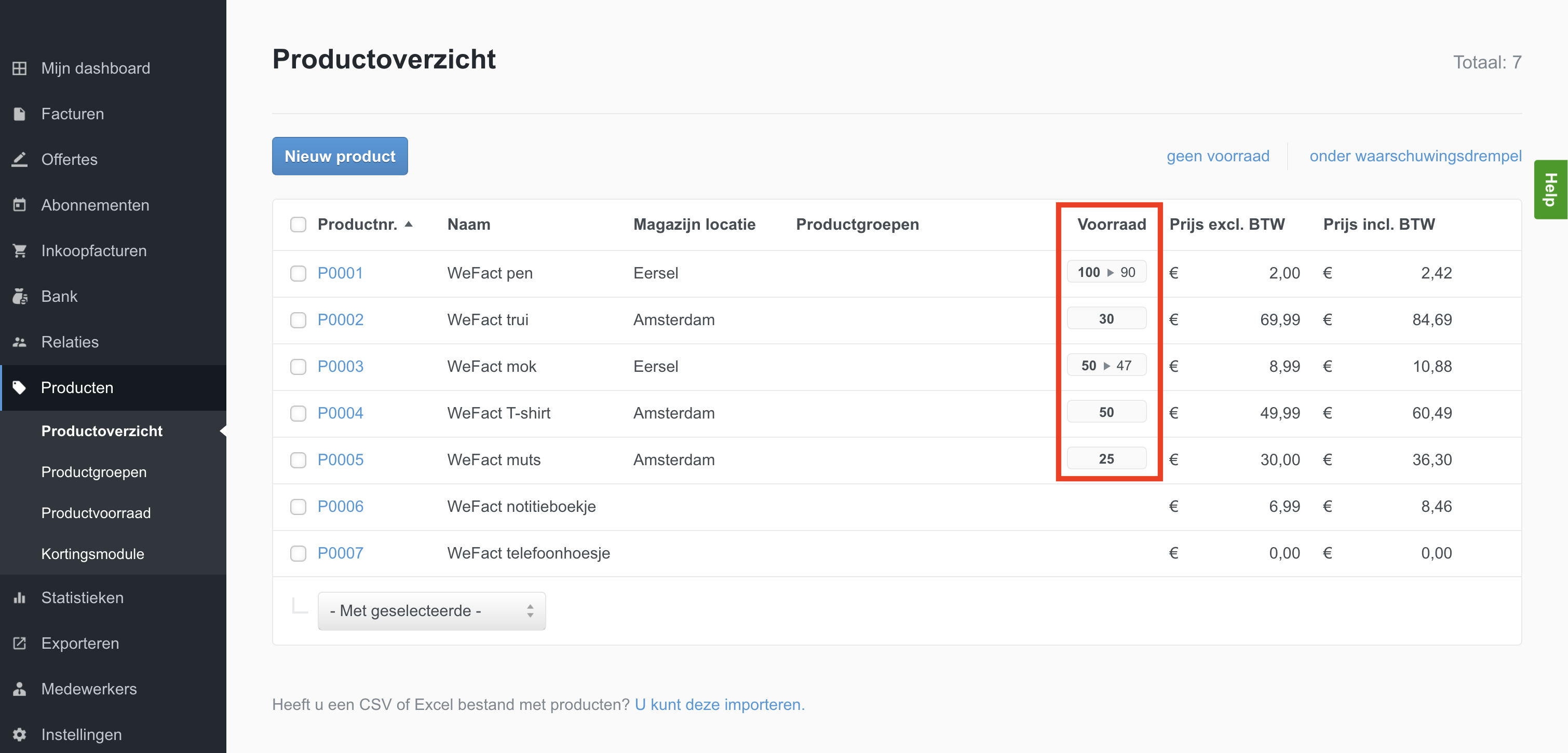 U kunt uw voorraad in WeFact raadplegen. Vanuit het productoverzicht heeft u een actueel overzicht van de voorraad en de gereserveerde voorraad.