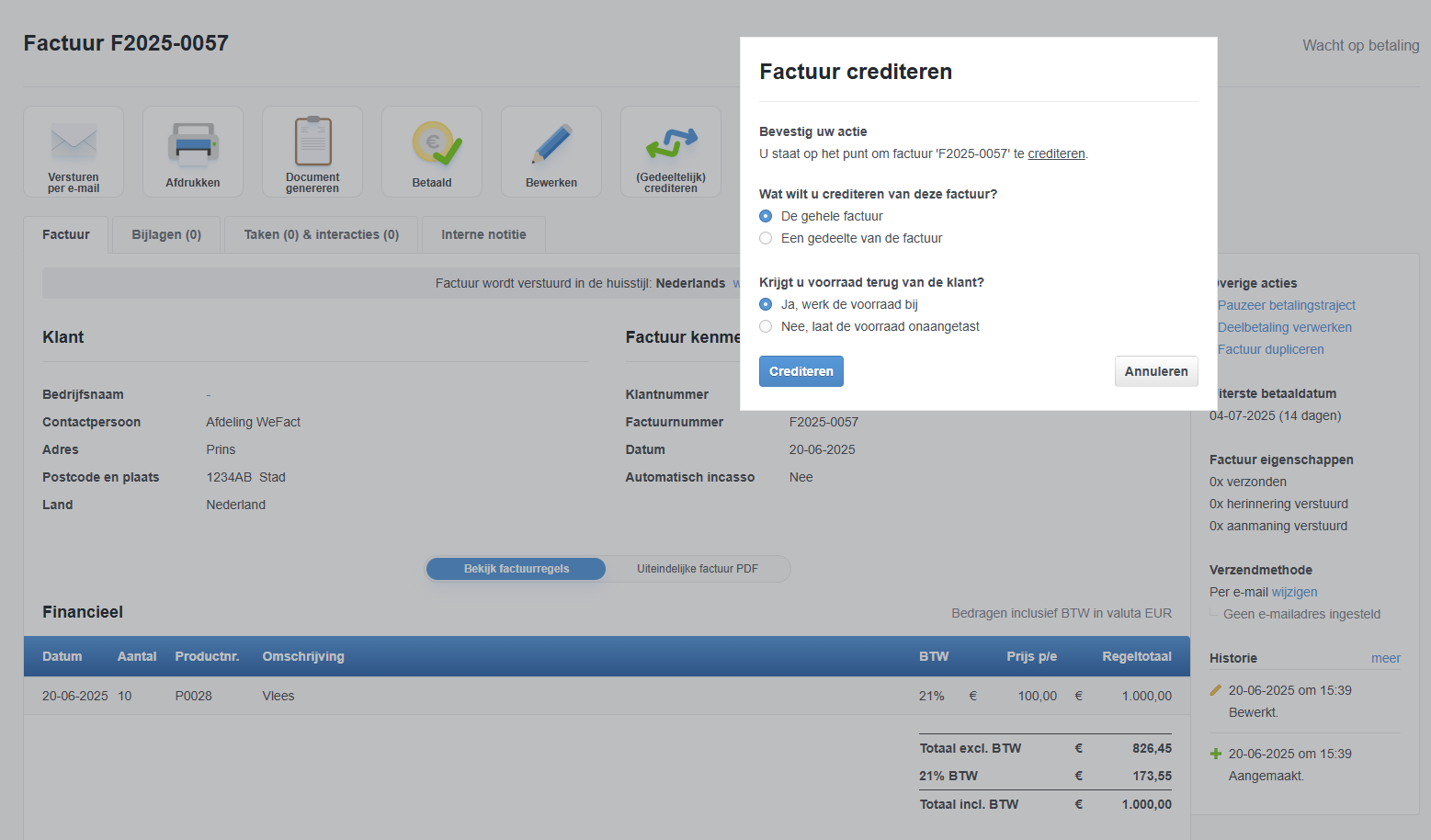 Soms komt het voor dat een factuur wordt gecrediteerd. Dit kan invloed hebben op uw voorraad. Bij crediteren van een factuur kunt u nu kiezen wat u met de voorraad wil doen. U kunt de voorraad bijwerken of u kunt de voorraad onaangetast laten.