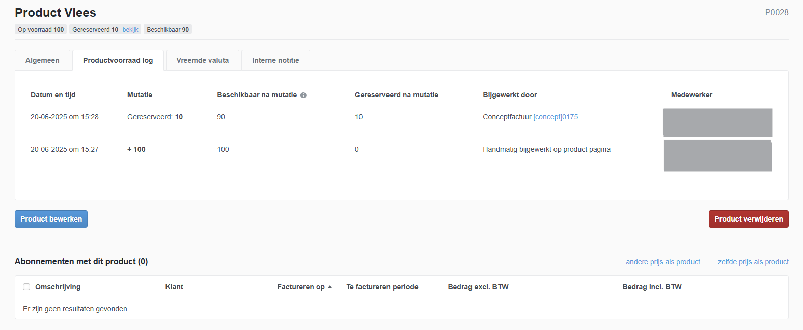 Vanuit het product heeft u inzicht in de beschikbare en de gereserveerde voorraad van een specifiek product.Door te kiezen voor de blauwe link “Bekijk reservering” heeft u inzicht in de datum en tijd dat een reservering op de voorraad is gedaan. Hier is het ook mogelijk op de reservering ongedaan te maken. Mutaties van voorraad vindt u terug onder het tabblad “Productvoorraad log”.