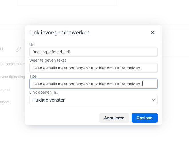 Heeft u (nog) geen afmeldlink in uw mailing opgenomen? U kunt dit zelf instellen. Ga in het menu naar "Relaties" submenu "Mailing". Kies voor de blauwe actieknop "Mailing aanmaken" of bewerk een bestaande concept mailing. Daarna klik je in de opmaakbalk op het icoontje om een link toe te voegen. Vul vervolgens onderstaande velden.
