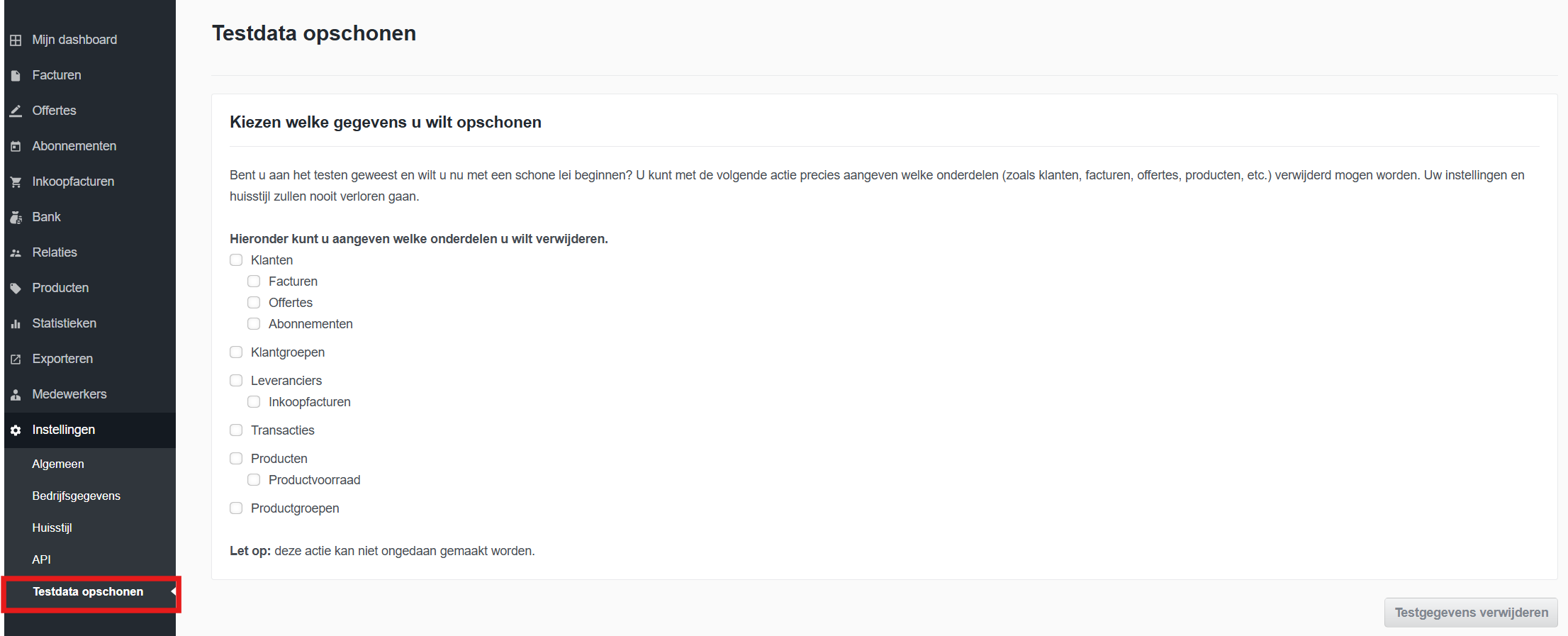 Wanneer de proefperiode voorbij is, zal (uit veiligheid) de optie om testgegevens te verwijderen niet meer zichtbaar zijn. Wilt u de testgegevens opschonen nadat u WeFact al heeft besteld? Neem dan contact op met onze helpdesk.