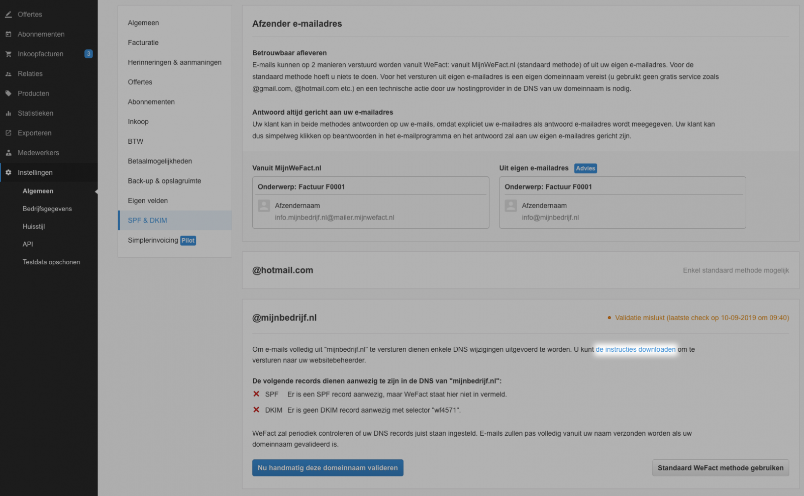 Ga in het menu naar "Instellingen" en kies voor het onderdeel "SPF & DKIM". Hier kunt u kiezen om uw domeinnaam te valideren. Vervolgens kunt u een document downloaden met persoonlijke instructies. Dit document kunt u doorsturen naar uw hostingbedrijf of ICT partij.